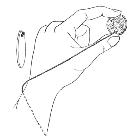 The left sleeve is pulled up, and the coin shown to the person in front, thumb being uppermost, and fingers lowermost. Only the thumb and forefinger grip the coin. THE CATGUT CUTS INTO THE HAND AT SUCH A POINT AND IN SUCH A WAY THAT IT IS INVISIBLE TO ANYONE BEFORE YOU. THEY LOOK AS CLOSELY AS POSSIBLE BUT THE COIN APPEARS JUST THE WAY IT NORMALLY SHOULD.