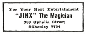 Flattery never gets past us. Mr L. J. Jenkins of Pittsburgh, Penna., and Secretary of the local I.B.M. Ring has a professional name which only goes to show that he is well up on modern magical literature. Personally, we have no knowledge of how Mr Jenkins came to use this odd appellation, nor for how long, but regardless, we like to hope that we inspired it.