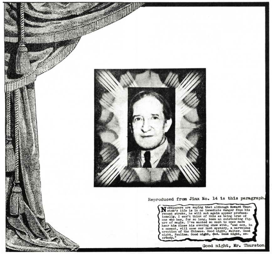 While the periodical and its editor are in mind I recall a day when at the office and John told an S.A.M. member that The Sphinx could be subscribed to only if one were known to be a magician or genuinely interested. He stated that orders from ‘outsiders’ had been and would be returned. I wonder how this thought can be reconciled with the fact that The Sphinx is sold to agents who display it in their Broadway store windows for all who have a quarter ? Sure, they carry The Jinx too, but then I’ve never held my right hand behind while gazing only at the left. Both hands are in front pounding out inane and useless paragraphs like this one.