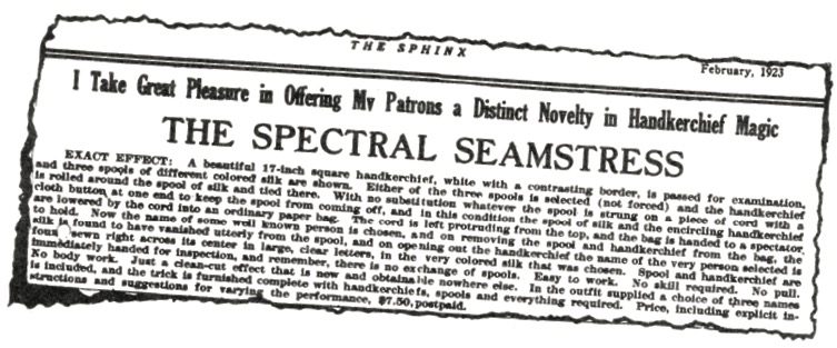 Read over the complete effect as per the advertisement above. Necessary adjuncts are four large handkerchiefs (white), three faked spools, and fifteen inches of cord with a needle and button at the ends. Three of the silks are prepared by having a prominent name sewn diagonally across each with different colored silk. The names may all be different, in fact, they should be. Each spool is wound with a different colored silk to match the names on the handkerchiefs. These spools are ordinary and ‘fakes’ are on each. The ‘fakes’ are shells to fit over the spools and each is covered with a layer or two of the different silks.