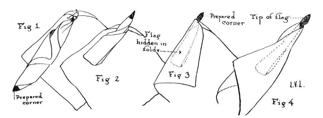 To prepare, take the corner of one of the flags which is diagonally opposite the field of stars, and either dye it red to match the red silk, or sew a piece of red silk to the flag. Canadian magicians will, of course, use the Canadian flag, in which case no preparation at all is necessary, and a spectator may be allowed to untie the silks at the end of the trick.