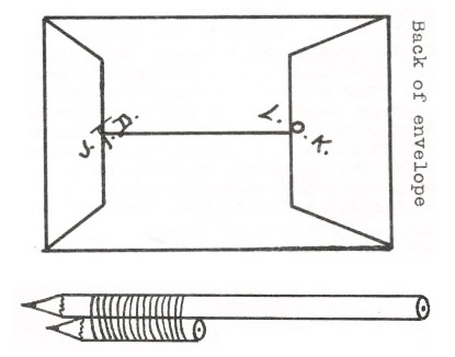 At the start of the performance, have the prepared pencil in the upper left vest pocket, double end up. Next to it is a plain pencil, similar to the long one. This is used to write on the first card and for signing the envelope. It is replaced in the pocket while the business card is being borrowed. The double pencil is then taken out and the prepared end concealed behind the envelope. With ordinary caution, there is no danger of detection. Do not use a pencil with a rubber tip. For obvious reasons this cannot be used to erase an error. If you think it necessary, carry a small eraser in your pocket. The distance between the pencil points (and consequently the written lines) can be increased by wrapping a strip of paper around the stubby pencil before fastening it to the longer one.