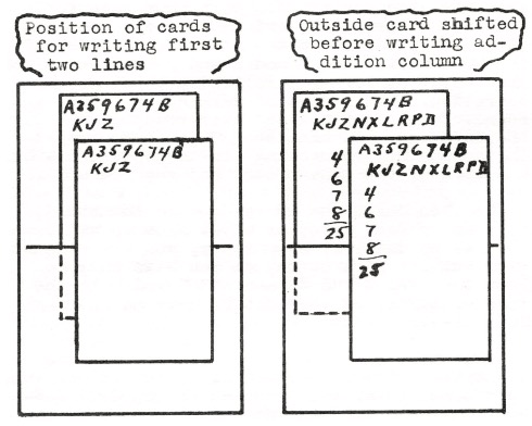 After the serial number has been written on both cards by means of the double pencil, move the pencil down a step and you will find no difficulty in writing the double row of letters as they are called out. Before starting this writing though, move the outside card slightly to the right. This will cause the line-up of numbers and letters to be varied slightly on the two ends. It is a small point, but the two cards might be compared later, and this will make them seem different, even though the formation of the letters and figures are individually identical.