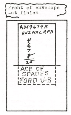 Four single digits, supplied by four different persons, are now written in a column and added. The envelope is then placed to one side, well out of the reach of any curious cuss who may wish to examine it. The business card with all the numbers and letters is now handed to one of the audience, and that favored gentleman formally invited to act as secretary for the remainder of the performance. Someone now shuffles a deck of cards and selects one. Its name is written on the business card by the secretary. The performer then asks the audience for the name of an automobile, and “Ford V-8” is noted on the card. After a brief recapitulation of the main points thus far, the performer takes up the envelope, produces a pair of scissors, and permits the one who signed his initials first to snip an end off, reach in, and withdraw the card.