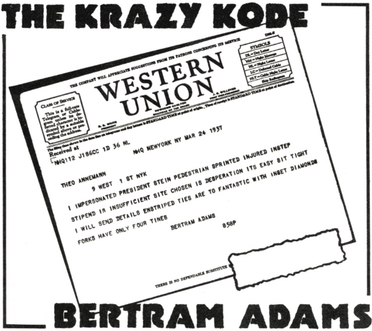 All one needs is a telegram as per that on the cover of this issue and two dice. The spectator actually selects the word as described above and you start to concentrate. After mussing your hair a bit and grunting, say “My dear sir, you evidently have never had your mind read before, and the word is coming to me in a jumble. However, I will call out letters as I get them, and you please cross them off as I call them. When you have crossed out the last remaining one of the letters in the word, say “RIGHT” in a loud voice in order that I may not sink too much into a trance.”