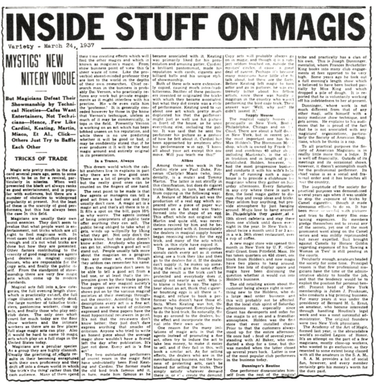 Well, here they are. The most discussed, denounced and damned articles regarding magic and magicians to make an appearance in many a moon. All three of the reproduced articles were put together by the same writer, and made their bows in Variety, a weekly trade paper for theatrics and professional thespians. After the review of the Heckscher Theatre show came out, hell started to pop around the magical emporiums and the resultant language would have shucked a green coconut at forty paces. Rumors flew like humming bird wings in a hurry and for a time it looked as though a lynching party was the only solution.