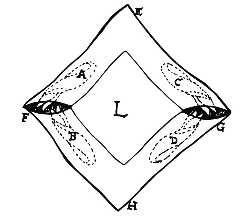 To present; Left hand holds corner F, and right hand corner G. The handkerchief is twirled about, freely showing both sides, and the hands otherwise empty. Left hand releases corner F, and seize corner E. Right hand releases its corner G, the “hole” corners being allowed to hang behind the handkerchief proper. Now, showing the right hand empty, it takes corner G and rapidly raises it to left hand, whose thumb and forefinger seize a corner of handkerchief C, the right thumb and forefinger seizing the other corner of the same handkerchief, releasing its hold of the outer handkerchief. Now, on stroking the right hand down master handkerchief L, handkerchief C is automatically drawn into view and hangs beside L in left hand. In the same manner right hand carries corner F up to left hand, and handkerchief A is drawn forth. Right hand runs down the three and holds them by corner H, left hand allowing other ends to fall free. By repeating the moves with left hand as made with right, the other two handkerchiefs are produced.