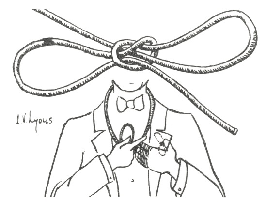 rope which is seen whole and solid, the left hand tossing the bow knot into