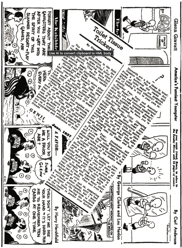 Laugh of the month : Walter Gibson has written “Now that Holden is putting out the Encyclopedia in printed form, I’ve been puzzled as to what to do with Gravatt’s mimeographed opus. Fortunately, Gravatt — who seems to think of everything — has himself provided the answer on page 9 of the June Genii. His last paragraph really furnishes the inspiration.” (We quote the Gravatt inspirational verbatim as well as reproductional on the funny page. Ed.)