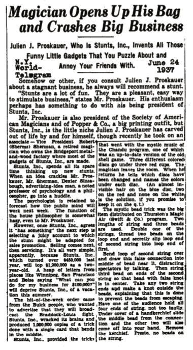 Off hand note : The Houdini name seems controlled by fate as well as reputation. The Summer 1937 Manhattan Directory has it in big type at the top of the page because of it being the first one in line ! — In the N.Y. Post for June 29th, somebody by the name of Albenice posed for a series of pictures exposing three tricks, the worst being the cigarette vanish in hank. His expressions are worth looking at, though. About as much personality (but not versatility !) as the thumb tip which is pictured. — Because of the undeniable popularity of the cups and balls at the present time, we’re starting a complete series next month which will be reprinted as the most exhaustive study of the subject known to exist. — Mitchell Kanter of Philadelphia has taken over the Keith Clark Encyclopedia of Cigarette Tricks and it will be off the press about the middle of July. This will be good news to those who have waited for their remittance to come back bearing fruit. I have plugged it before as the greatest (I saw the manuscript and all pictures) and I’ll do so again with renewed confidence. — What is that rumor going about that says a too well known announces foreign trips and hides away at a road side eatery in New England ? Or do such things just pop up as a result of too many hard knocks with a hank pull ? — Caryl Fleming had a bit of advice at High Point. Fleming’s idea of writing is to give each trick completely and without any of that “use your favorite method” business. Even if the force, or vanish is old, Caryl says it should be given to make the effect absolutely complete in detail throughout. There are many who may know the “bit” you put in, but there are many also who don’t, and many who have read it somewhere but the exact details have slipped their mind. Why sell a trick, and then compel the reader to check up somewhere else for the main part of it ? Or experiment with a number of “favorite methods” when the writer is in a position to give them the best for that particular effect ? The advice is O.K. with us, Mr Fleming, and from now on try to find fault, on that point, at least.