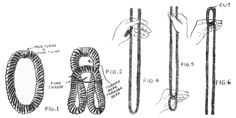 Pick up the rope and scissor with the left hand. Transfer scissor and one end into the right hand. Hold the other end in such a manner that the gimmick is concealed palmed in the left hand (see Fig. 4). There is apparently a single piece of rope. Pair the two ends in the left hand. Bring down the left hand along the rope as if to stretch out the rope full length but really carrying down the threaded rope (see Fig. 5). With a little pressure the fine thread is broken, releasing the circled rope into its full dimension. Bring this end up as in Fig. 6. Cut at point shown, and effectively demonstrate two apparent cut pieces.