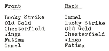 These are dried under pressure and trimmed neatly to size. Assemble (disregarding backs) by placing in this order: Lucky Strike, pack of Camels, Camel, Fatima, Wings, Chesterfield, and Old Gold.