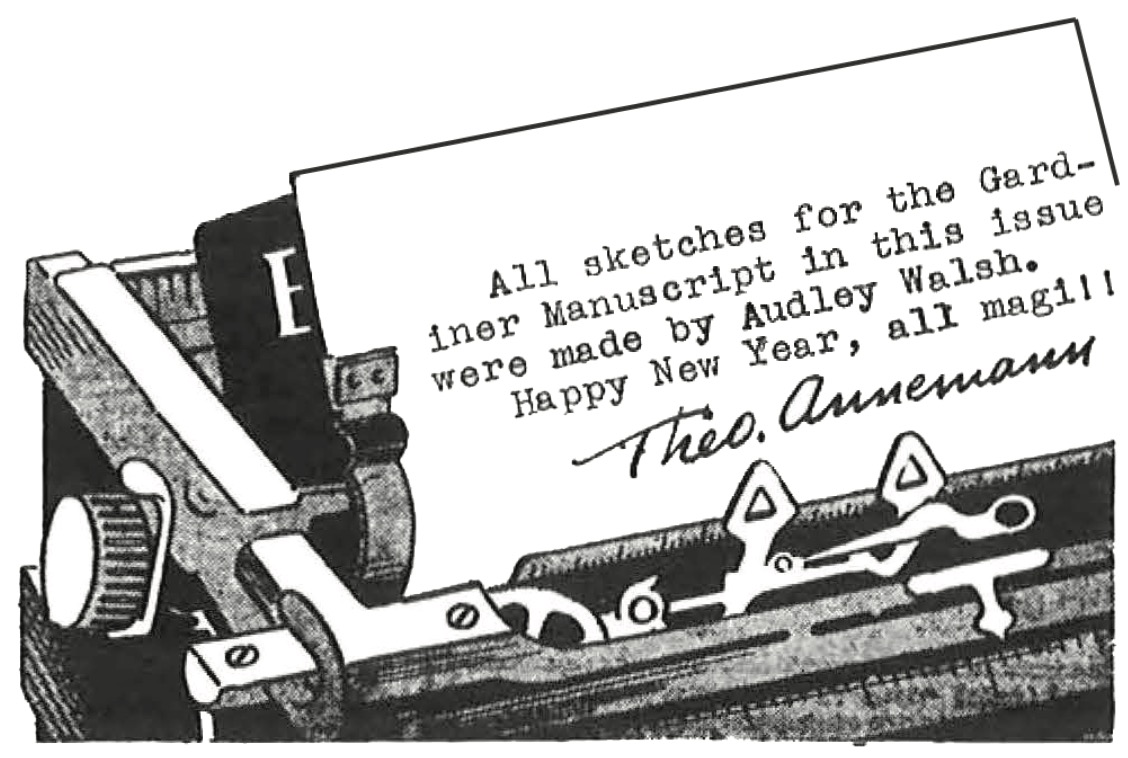 Looking for publicity and trouble department : Sedrick Hoyt (Earl G. Heyl) of Baltimore wrote the liquor commissioner of N.J. and asked about the law when it came to a magician producing drinks. Burnett was reported surprised to learn that alcoholic ingredients were needed for the trick, and proceeded to lay down the rules : “No legerdemain in summoning up and dispensing alcoholic drinks is permissible upon unlicensed premises. If the feat is accomplished on licensed premises you must take out a special permit for yourself to charm the spirits, and for your bewitching assistant to dispense them. Both of you must be of age and good citizens.” — Harry Opel, of Toledo, writes and publishes The Voice From the Attic, a non punch pulling monthly for magicians with a circulation of ONE copy. It is finishing its NINTH year, and is sent by him each month to a different magician. I’ll give a year’s subscription to The Jinx for every copy sent me by those who may have one, regardless of the condition.