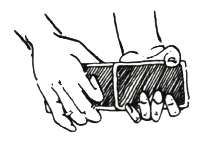 The decks are given a single cut and exchanged. Actually you execute a false cut, but since he is concerned with cutting his own deck the move will not be detected. Personally I prefer to use an old gambling cut that is made as follows: the deck is held horizontally in the left hand, backs to audience as shown in the illustration. The thumb is on top and the fingers below. The right hand draws the lower half of the deck to the right, and with a slight upward flourish it slaps the half on the table. The hand then returns to take the remaining half and place it on the cards on the table. The left hand never moves. Correctly executed, the false cut actually looks more genuine than a true cut made with the same motions!