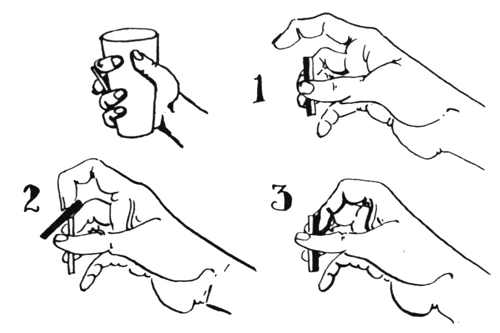 The first trick is now fairly well known. Clip a silver quarter between the first and second fingers ad pick up a glass of water as shown. The quarter is invisible to those in front. By applying pressure with the middle finger and allowing the edge of the quarter to slip from between the fingers, you can cause the quarter to strike the glass with a loud “click”. If you raise the glass to your mouth and pretend to bite the edge nearest you just as you make the click, the illusion of cracking the glass with your teeth is very effective. Particularly so if you have some bits of ice in your mouth which you proceed to crunch upon!