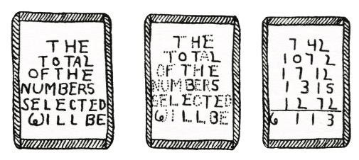 A number of white pasteboard cards are shown all different and to contain a number on one side, all numbers varying in the hundreds and thousands. The cards are shuffled, and after cutting, a spectator removes five, holding number sides down. On a slate the performer now chalks “THE TOTAL OF THE NUMBER SELECTED WILL BE“, explaining that a helpful spirit will write in chalk the total of the addition to be arrived at presently. Another slate is given spectator, he copying the numbers selected onto slate and adding them up. While this is being done, the first slate is given another to hold.