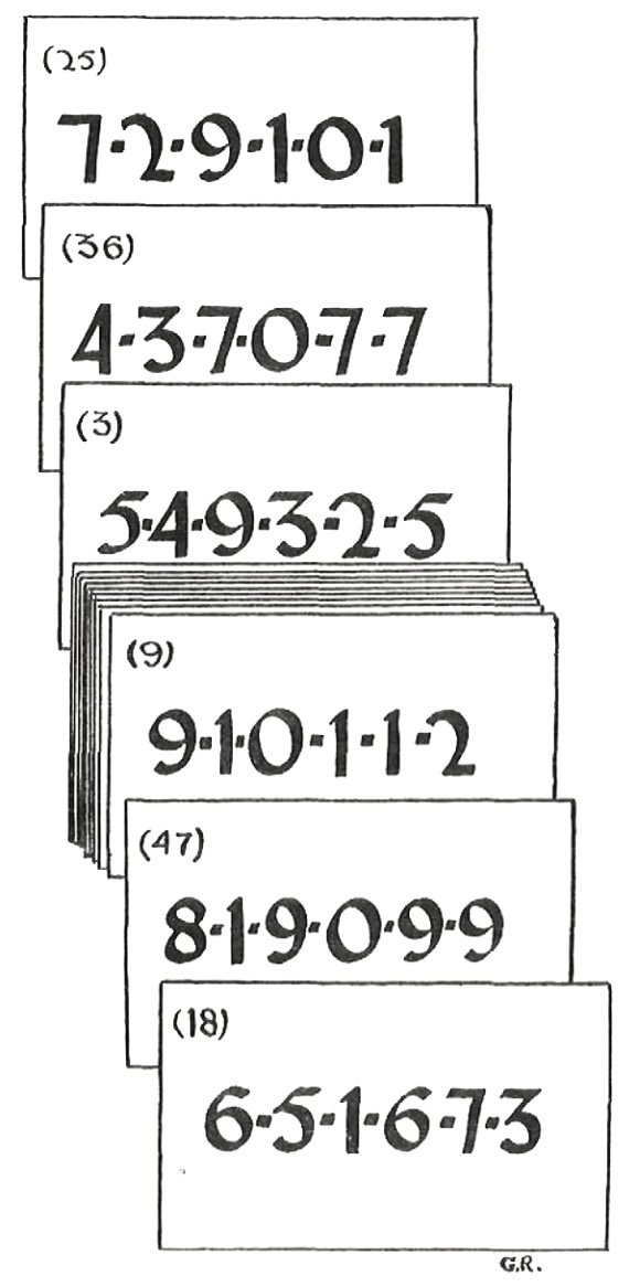 It is not necessary to memorize any numbers. Each card bears, in addition to the six figure number, a serial number 1, 2, 3, 4 and so on, in small type on the same side of the card, and it is on these serial numbers that the six figure numbers are based.