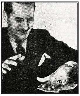 For instance, suppose the card named is the Five of Clubs. Deck is removed with blue backs upward. You know the top 13 pairs represent Spades, so you fan carelessly and start counting the backs beginning with the dotted (14th) card. As you pass the fourth and reach the fifth, a little pressure brings the Five of Clubs face up into view.