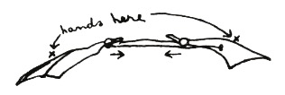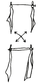 The silks mysteriously creeping toward each other makes a nice finish. To do this, take one of the red silks you discover at finish when green is missing and tie a black silk thread (about an inch less than the diagonal length of the silk) to one corner. Then knot the corner. Tie a small black button to the other end of the thread. Knot the end of the 2nd red silk around the thread so the hank will slide freely. This duplicate set is rolled so that the thread will not tangle when taken from the glass.
