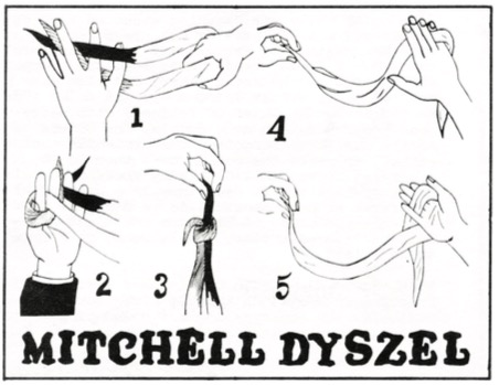 Hold a 30 inch square silk handkerchief of solid color by the opposite corners. Roll the silk by the usual swinging of it in a circular manner. Then hold it as shown in illustration 4. More than one-third of the silk is hanging over the right little finger. Bend your first, second and third fingers around the silk and give your right hand a twist towards your body. Form a loop around the three fingers by turning the palm up and throwing the loose end of the silk over the section held between the two hands. This loose end is now on the side facing the audience. See illustration 5.