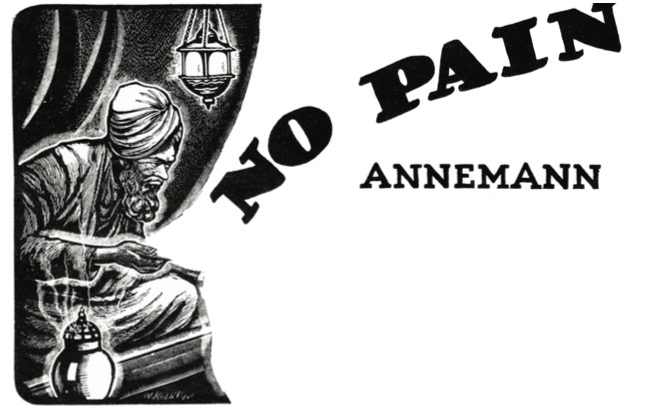 Look down at your arm. The needle still goes in and comes out. You jiggle it a bit and say, “No pain — and I mean no pain !” And at that moment you let your right hand drop and go directly into an open and set muskrat trap which responds beautifully with a terrific snap and takes you to task. That’s your climax. You arise and cry “No pain,” just once more, and stalk out of the room without further ado.