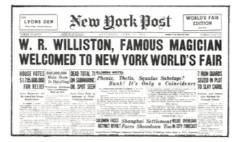 Getting the last Jinx out over 2 weeks ahead of our usual date resulted in being scooped out of that Larsen-Proskauer picture featured in the other mags. ‘Twas a sad blow. “As a result of a long talk I had with Mr. Proskauer,” stated Mr. Larsen, “I feel certain that magicians may be assured of his hundred per cent cooperation in the future.” Since the Battle Creek convention, the ex-prexy of the S.A.M. has been actively engaged in forming a N.Y. Ring of the I.B.M. The N.Y. Post has a publicity gag at the World’s Fair. Copies of the daily are at hand with the double streamer lines left out. The printer in the booth has a bottom line set up to read WELCOMED TO NEW YORK WORLD’S FAIR. You write your own top line and get 4 copies for $1. Some of the locals are stuffing their press books, one or two going to the length of having copy set up for a paste in before getting the front page photo-offset reproduced. Not that we look down on things which impress the public but this is a bit raw simply because no magician ever got that kind of publicity. Committeemen aren’t too dumb and a palpable fake in the display book can hurt the other hard earned notices.