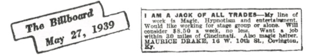 “Think a Drink’ Hoffman is in N.Y. with The Streets Of Paris musicale, and Joan Brandon, fresh from Europe, is at The Glass Hat, Hotel Belmont-Plaza. Carl Rosini has four illusions in a separate room of Ripley’s Odditorium, presented by Albenice. Three are mirror gadgets and the other a human pin cushion effect. Speaking of mirrors, the headless woman era is with us to a fare-thee-well. First described in Hilliard’s Greater Magic, this modern version of the Colonel Stodare Sphinx illusion is “tops” as the best mirror dodge yet conceived. Sam Margulies tells me there are well over 300 in the country right now which fact, and it recalls the “sawing” splurge, will ruin the stunt in one season. By the end of this year, and during the next, you’ll see plenty of walk through exposes gloming the nickles. Of the two at Coney Island, one at the Fair, and one in Hubert’s Museum, the Ripley presentation comes closest to an expose. Without discussing ethics, the presentation speil is along accidental lines tied in with the experiments of Alexis Carrel and others for keeping hearts and organs alive artificially. The curtains are drawn aside and the convulsive actions of the benecked lady are evident while tubes run from the wherewithals to machinery flashing lights and pumping gaily colored liquids. A nurse stands by for the minute or so before the curtain drop and the crowd pumped out at the rear. At Ripley’s, the one place where the “believe it or not” slogan is injected at every turn, and by all exhibit speilers, there is more excuse than ever to tell the story and leave them wondering. However, the gal comes out immediately afterwards to show her head in place, and no one goes away with any further wonderment, and certainly no incentive for telling friends to see the thing. Maybe Rip is sensitive to the point where he fears that if it is presented straight people may lift eyebrows at his other and genuine oddities.