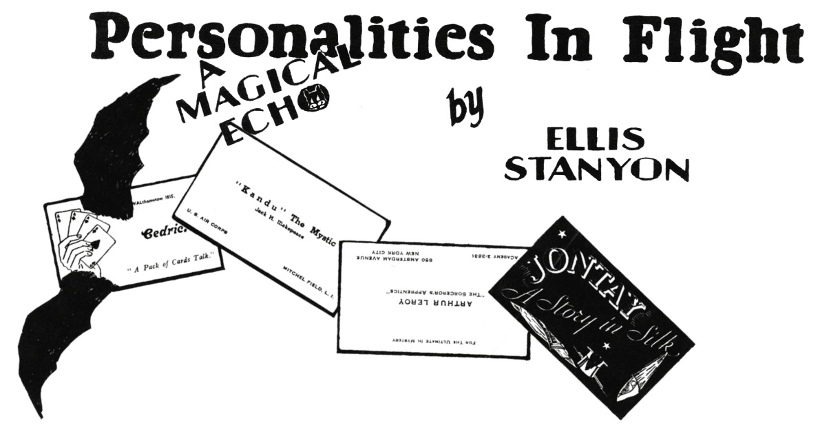 To facilitate the working of the effect remember that one must memorize the name on the visiting card last secretly passed under the cover at #1 position. This, always, is the name to be read aloud, apparently from the card that is picked up next. A spectator may be on hand to check ARRIVALS under #1 cover. The performer calls a card and later he admits of and shows its arrival. The spectator admits of a personality in flight.