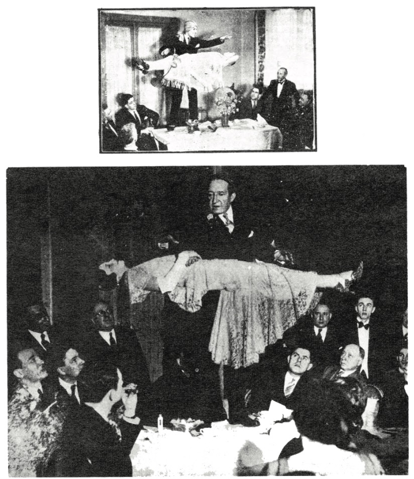 We applied all three of those requisites to very good results. First came the experience. We dimly remembered something away back in the past that strummed a memory chord. Time came next. We spent quite a few hours digging back into the files under all sorts of classifications, finally getting into back magazine copies for yars upon yars. Then it was found – a picture taken of Thurston at the William Penn Hotel in Pittsburgh on January 8, 1931. The Sphinx ran it in the March issue of that year. Next came trial. Trial by skepticism. We could recognise two of those present. The first, John Northern Hilliard, has passed on. The second, Bill McCaffrey, is as full of trickery as ever. We wrote. Bill answered. “We were giving Thurston a banquet and one of the club members, Mr. Irving Newman, an excellent local news photographer, thought he would take a publicity picture. The girl was placed on a board which was supported by the backs of two chairs and he photographed her in that position. Then Thurston stepped on the table and those of us left stared at where the girl was supposed to be. Newman then printed both pictures together with the result that you have seen. It was a clever bit of work, especially the shadows from the dress that are visible in the picture. They were drawn in by an artist and the effect was that of a miracle happening in a hotel banquet hall. As it happened, the editor turned it down because of the picture being fake. Newman made up only a few prints for his friends.”