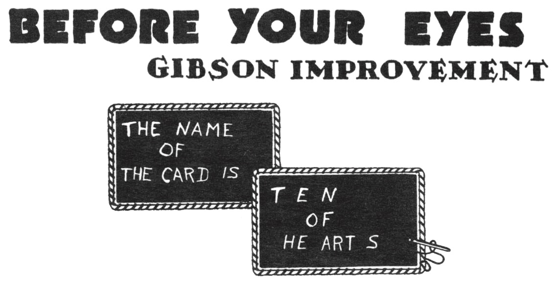 Use an ordinary slate with a flap for it. On the slate proper paint the letters for the Ten of Hearts, spacing them properly. Next fill in the proper empty spaces with chalk letters to make up the sentence shown. Cover this with the flap. To present, pick up the slate and write the sentence openly upon the flap, exactly as it is on the slate proper underneath. Lay it writing side down on a table while the card is forced. Pick up the slate leaving the flap behind. IT appears the same as when first written before their eyes. Then erase, and the chalked letters disappear leaving the paint ones for the novel and startling disclosure.