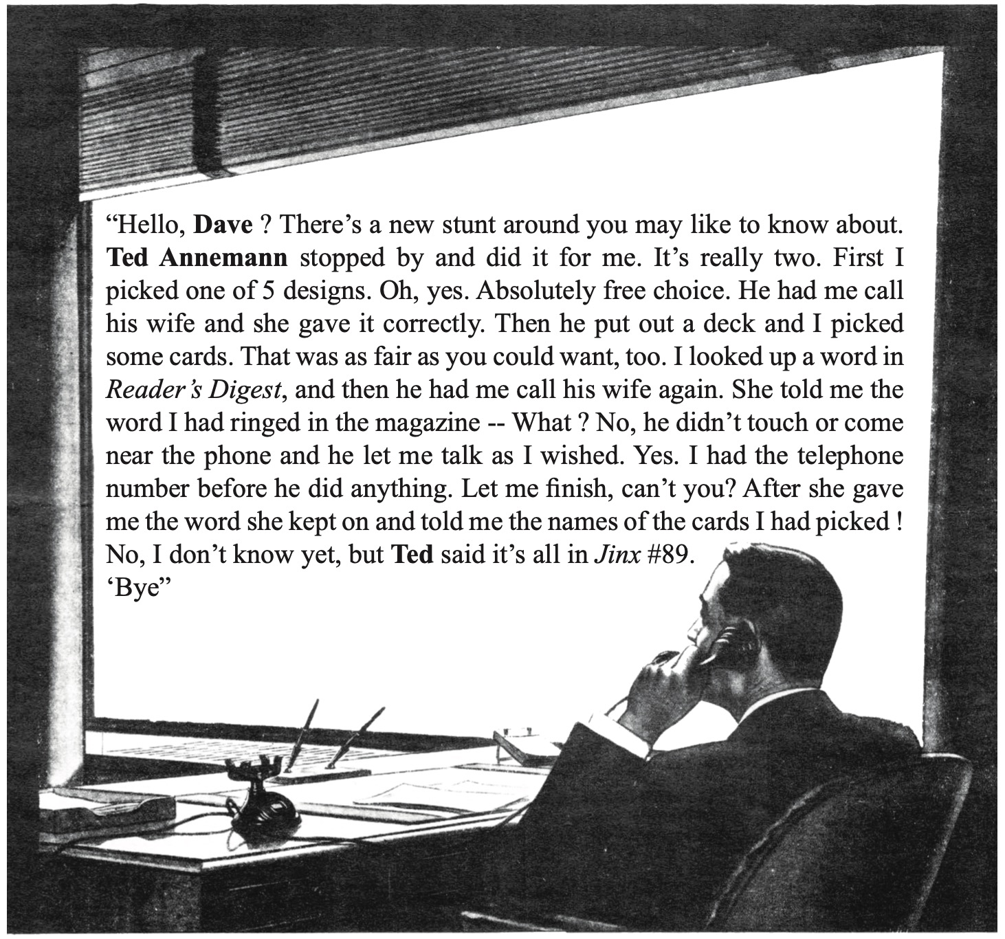 That telephone mystery is quite simple and easy when the lid is lifted. The use of drawings, word, and cards serves to make it look complicated and also keeps the mind of the person busy.
