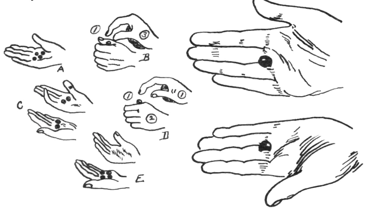 To perform the experiment, the five balls are taken from a pocket with right hand, and one gripped between fingers, as explained above. Throwing four into left hand, and displaying them to company, one is secured between second and third fingers, and three tossed back into right, which is simultaneously turned to show four balls only. This hand-to-hand business is executed several times in order to convince the onlookers that no duplicates are used. No verbal attention, however, is drawn to the fact.