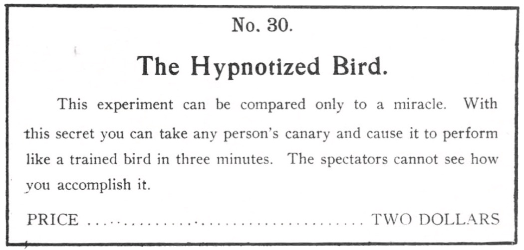 “After a good deal of fluttering of the canary bird in the cage Hardin would finally manage to catch hold of him. This was to demonstrate that the bird was very much alive. Taking the feather, he would brush it in front of the bird’s eyes several times, and then would put the feather near the claws of the bird so that it would take hold with its feet. When Hardin got the bird in position, the canary would hang in an upside down position as though it were dead. He could even roll it along the table top.