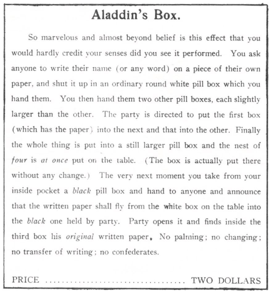 “You commence by having the black box with the cover separate in your left coat pocket. The other boxes are all separated in your right coat pocket. Take out the smallest box and hand it, together with a small piece of paper, to a party. He writes on the paper any name or word. He puts it in the box, closes it, and you hand him, one after the other, the two next larger boxes. He puts one into the other, closing each as he does so.