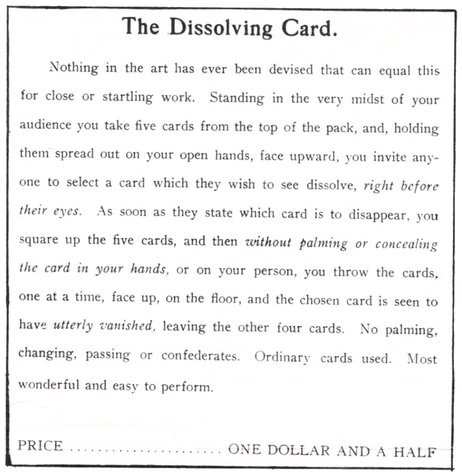 I must pick up just one more ad in entirety. It’s a perfect example of Hardin thinking, and of a secret’s value when not known to anyone but the performer. First read the prospectus. The instructions were to moisten the finger from the tongue and wet the top card of a pack. Five cards were then removed in a fan, but the top card was kept behind the next so that only four apparently were used. With one selected “you close the cards in such a manner that the wet card is on top of the face of the chosen card. Now square them up and pinch firmly together. Gently tap the packet and command the chosen card to vanish. In a careless and off-hand manner toss the cards, one by one, face up on the floor. There are four cards still, but the chosen card is missing.” I saw Nate Leipsig do the trick a number of times. A card can be dropped flatwise and it always will float to the floor without turning over. Flatwise, not edgewise. Twice that I can remember he let those stuck together cards fall with the others and WALKED away from them as he STARTED TALKING ABOUT ANOTHER TRICK which he proceeded to do with the rest of the pack. In the meantime, a friend picked up the cards from the floor and returned them to him a few minutes later. It was so unconcernedly done, and with such utter disregard for the cards, that the watchers had to think back to remember the exact moves — and all they could remember was that their card “went away” right before their eyes.